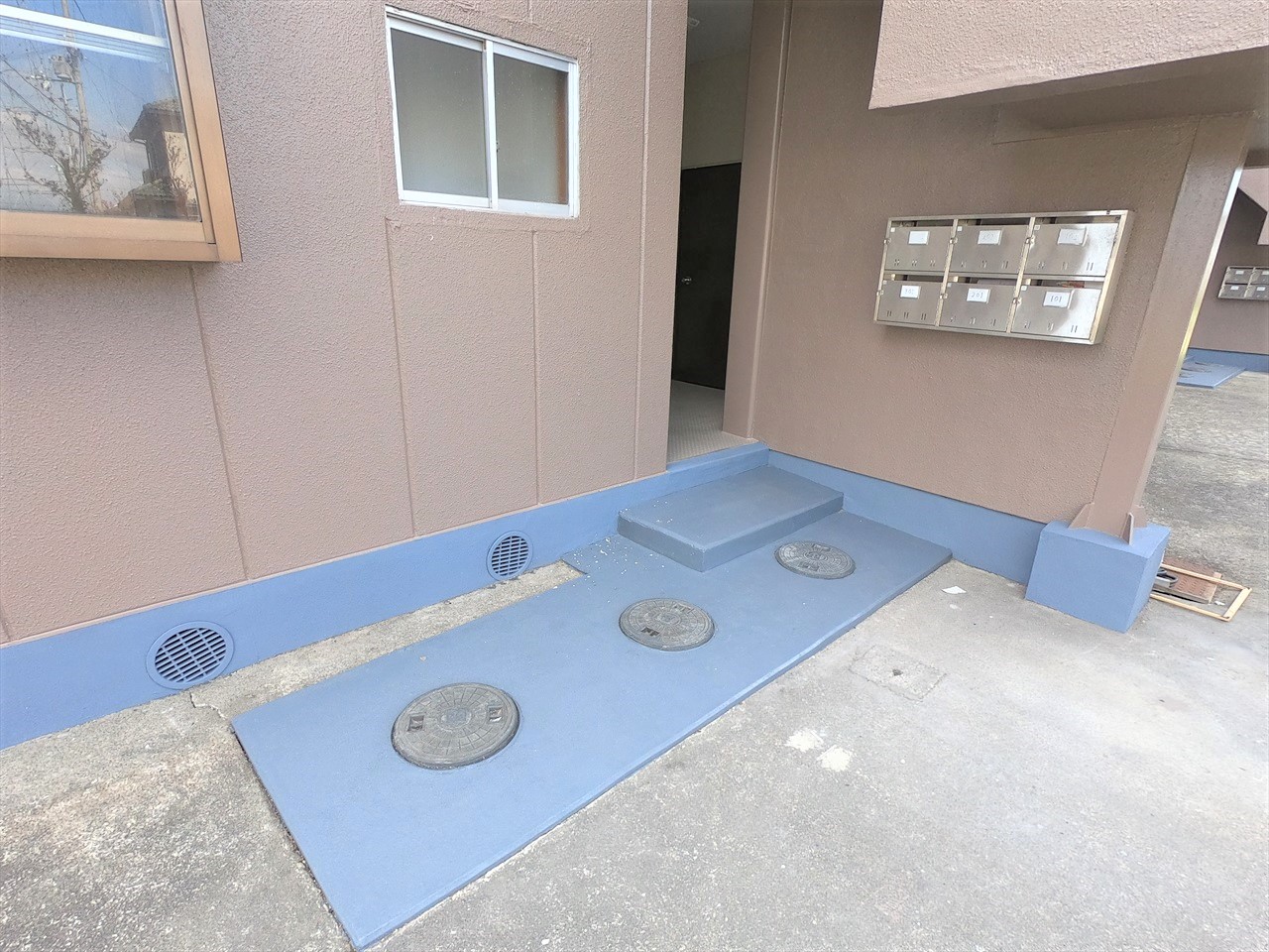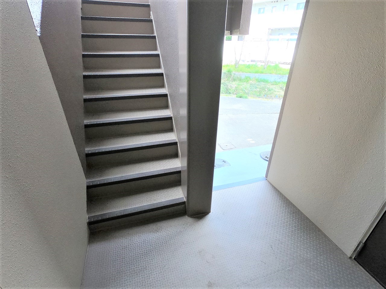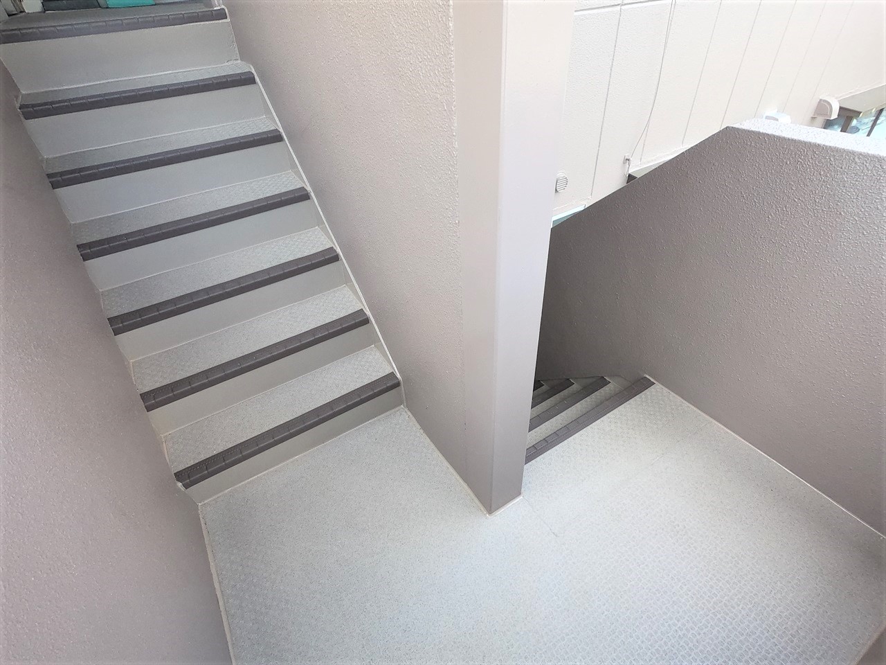 外壁塗装、防水工事を行い、階段・廊下にはノンスリップ塩ビシートを貼りました。